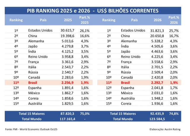 De acordo com Alex Agostini, economista-chefe da Austin, entre os diversos indicadores revisados, o relatório revelou que houve mudanças importantes de posições entre as nações que compõem as 15 maiores economias do mundo pelo PIB em dólares, que representam 75% do PIB global.