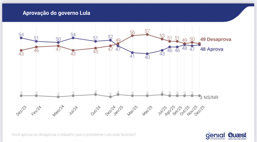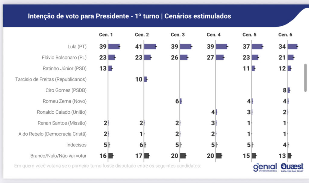 A Quaest considerou seis cenários para o primeiro turno sem o ex-presidente na disputa e Lula vence os rivais com percentuais de 34% a 41%, mesmo com a desaprovação do governo Lula tecnicamente empatada com a aprovação, com placar de 49% a 48%.