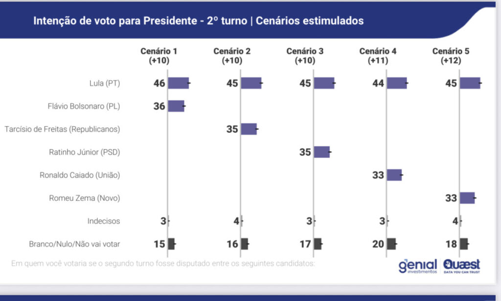 Em um eventual segundo turno, a pesquisa traçou seis cenários e, em todos eles, Lula vence, com 44% a 46% das intenções de voto e vantagem entre 10 pontos percentuais contra Flávio, Tarcísio e Ratinho, mostrando que as chances dos três para derrotar Lula ainda são pequenas. Enquanto isso, no embate contra Caiado, a vantagem do petista é maior, de 11 pontos percentuais e, contra Zema, de 12 pontos.