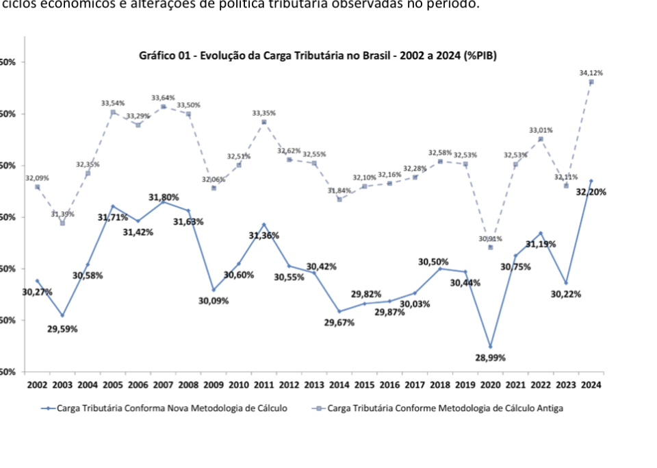 Na metodologia anterior, a carga tributária tinha batido recorde histórico em 2024, quando chegou a 34,12% do PIB – patamar equivalente à média dos países da Organização para Cooperação e Desenvolvimento Econômico (OCDE), o chamado clube dos ricos, de 34% do PIB.