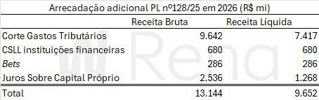 “Somando os cortes de gastos tributários aos aumentos de alíquotas, temos que o projeto aprovado poderia angariar R$ 13,1 bilhões em arrecadação bruta e R$ 9,7 bilhões em receita líquida no ano de 2026”, destacou Salto em relatório enviado aos clientes citando as modificações no texto da proposta.