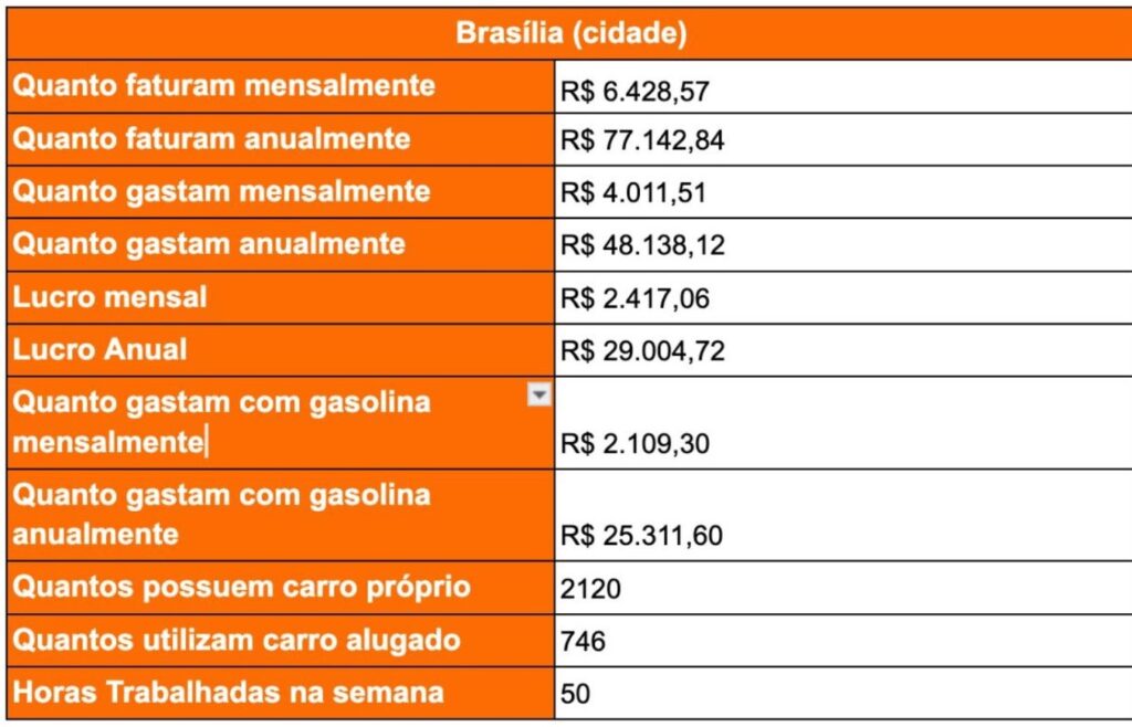 Em Brasília, uma cidade conhecida pelo alto custo de vida, o profissional que trabalha 50 horas por semana ganha R$ 6.428,57 – o que dá um faturamento anual de R$ 77.142,84 e lucro, no mesmo período, de R$ 29.004,72. Ele gasta só com gasolina R$ 25.311,60. Na capital federal, 2.120 têm carro próprio (declarados ao estudo da GigU). O lucro mensal não passa de R$ 2.417,72.